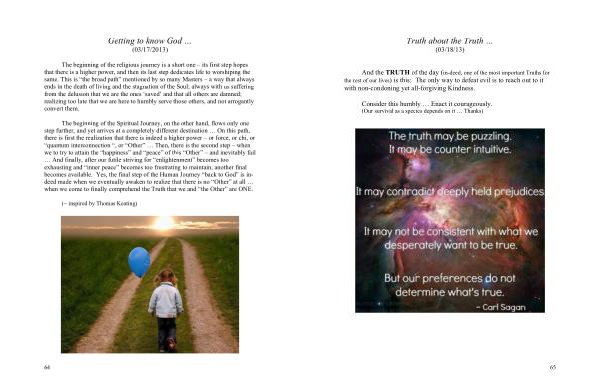 The beginning of the Spiritual Journey , on the other hand , flows only one step further , and yet arrives at a completely different destination … On this path , there is first the realization that there is indeed a higher power – or force , or chi , or “ quantum interconnection “, or “ Other ” … Then , there is the second step – when we to try to attain the “ happiness ” and “ peace ” of this “ Other ” – and inevitably fail … And finally , after our futile striving for “ enlightenment ” becomes too exhausting and “ inner peace ” becomes too frustrating to maintain , another final becomes available . Yes , the final step of the Human Journey “ back to God ” is indeed made when we eventually awaken to realize that there is no “ Other ” at all … when we come to finally comprehend the Truth that we and “ the Other ” are ONE .
