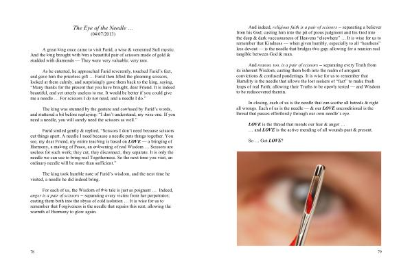 In closing , each of us is the needle that can soothe all hatreds & right all wrongs . Each of us is the needle — & our LOVE unconditional is the thread that passes effortlessly through our own needle ’ s eye .