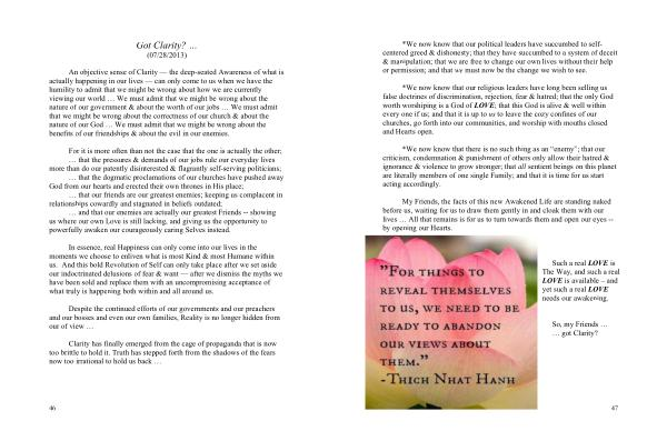 In essence , real Happiness can only come into our lives in the moments we choose to enliven what is most Kind & most Humane within us . And this bold Revolution of Self can only take place after we set aside our indoctrinated delusions of fear & want — after we dismiss the myths we have been sold and replace them with an uncompromising acceptance of what truly is happening both within and all around us .