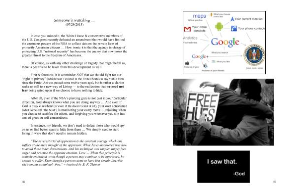 After all , even if the NSA ’ s piercing gaze is not cast in your particular direction , God always knows what you are doing anyway … And even if God is busy elsewhere ( or even if He doesn ’ t exist at all ), your own conscience ( what some call “ the Soul ”) is monitoring your every move — rejoicing when you choose to sacrifice for others , and forgiving you whenever you slip into acts of greed or self-centeredness .
