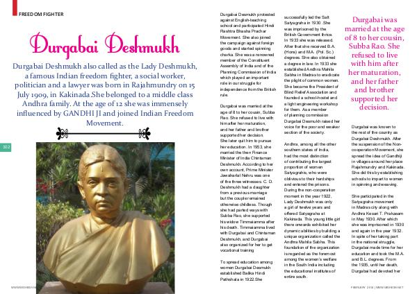 Durgabai Desmukh protested against English-teaching school and participated Hindi Rashtra Bhasha Prachar Movement. She also joined the campaign against foreign goods and started spinning charka. She was a renowned member of the Constituent Assembly of India and of the Planning Commission of India which played an important role in our struggle for independence from the British rule.