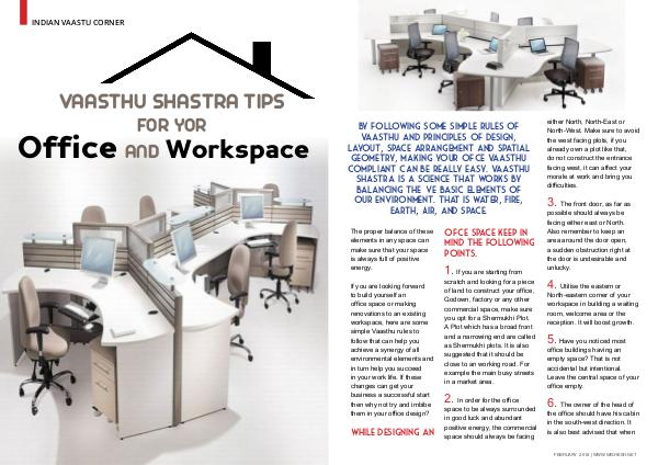 INDIAN VAASTU CORNER VAASTHU SHASTRA TIPS Office 154 WWW.WISHESH.NET | FEBRUARY 2018 FOR YOR AND Workspace