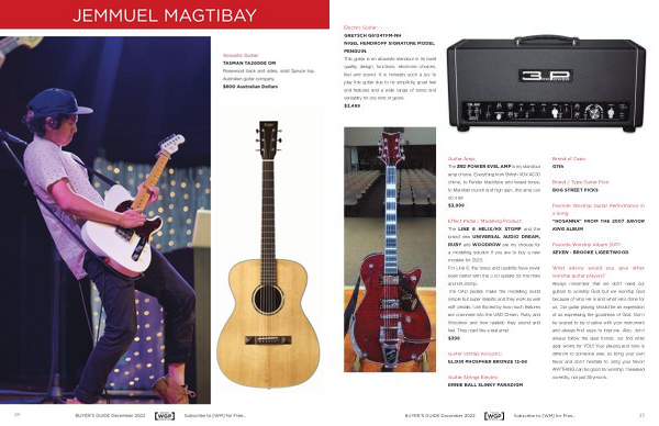 What advice would you give other worship guitar players ? Always remember that we don ’ t need our guitars to worship God but we worship God because of who He is and what He ’ s done for us . Our guitar playing should be an expression of us expressing the goodness of God . Don ’ t be scared to be creative with your instrument and always find ways to improve . Also , don ’ t always follow the gear trends , but find what gear works for YOU ! Your playing and tone is different to someone else , so bring your own flavor and don ’ t hesitate to bring your flavor ! ANYTHING can be good for worship if tweaked correctly , not just Strymons .
