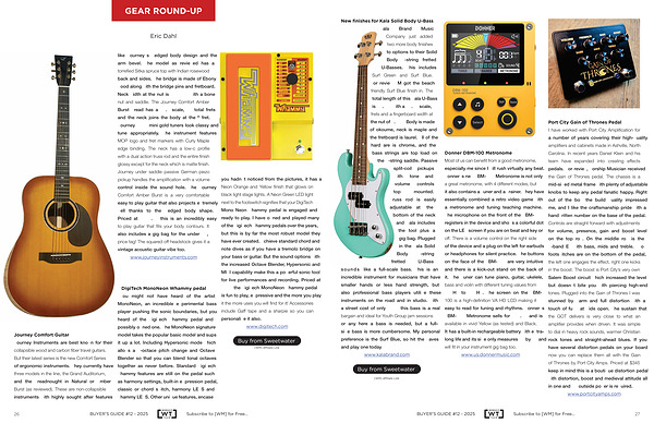 U-Basses. This includes Surf Green and Surf Blue. For review WM got the beach friendly Surf Blue finish in. The total length of this Kala U-Bass is 33.35” with a 23.5” scale, 22 frets and a fingerboard width at the nut of 1.625”. Body is made of okoume, neck is maple and the fretboard is laurel. All of the hardware is chrome, and the bass strings are top load on the 4-string saddle. Passive split-coil pickups with tone and volume controls top mounted. Truss rod is easily adjustable at the bottom of the neck and Kala includes the tool plus a gig bag. Plugged in the Kala Solid Body 4-string fretted U-Bass sounds like a full-scale bass. This is an incredible instrument for musicians that have smaller hands or less hand strength, but also professional bass players utilize these instruments on the road and in studio. With a street cost of only $ 369 this bass is a real bargain and ideal for Youth Group jam sessions or anywhere a bass is needed, but a fullsize bass is more cumbersome. My personal preference is the Surf Blue, so hit the waves and play one today! www. kalabrand. com