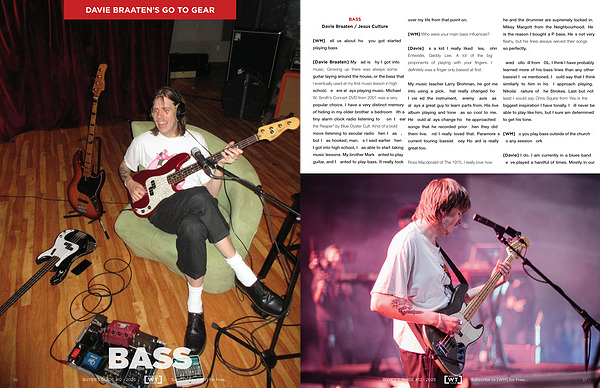 [ Davie Braaten ] My Dad is why I got into music. Growing up there was always some guitar laying around the house, or the bass that I eventually used at my first music lesson in high school. We were always playing music. Michael W. Smith’ s Concert DVD from 2001 was a very popular choice. I have a very distinct memory of hiding in my older brother’ s bedroom with a tiny alarm clock radio listening to“ Don’ t Fear the Reaper” by Blue Oyster Cult. Kind of a bold move listening to secular radio when I was 6, but I was hooked, man. As I said earlier when I got into high school, I was able to start taking music lessons. My brother Mark wanted to play guitar, and I wanted to play bass. It really took over my life from that point on.