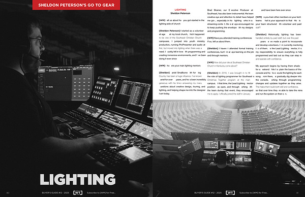 [ Sheldon Peterson ] I started as a volunteer at age 14 at my local church, which happened to be one of the Southeast Christian Church campuses. I jumped into youth ministry production, running ProPresenter and audio at first, but moved into lighting when there was a need. I quickly fell in love with programming and creating immersive environments, and I’ ve been doing it ever since!