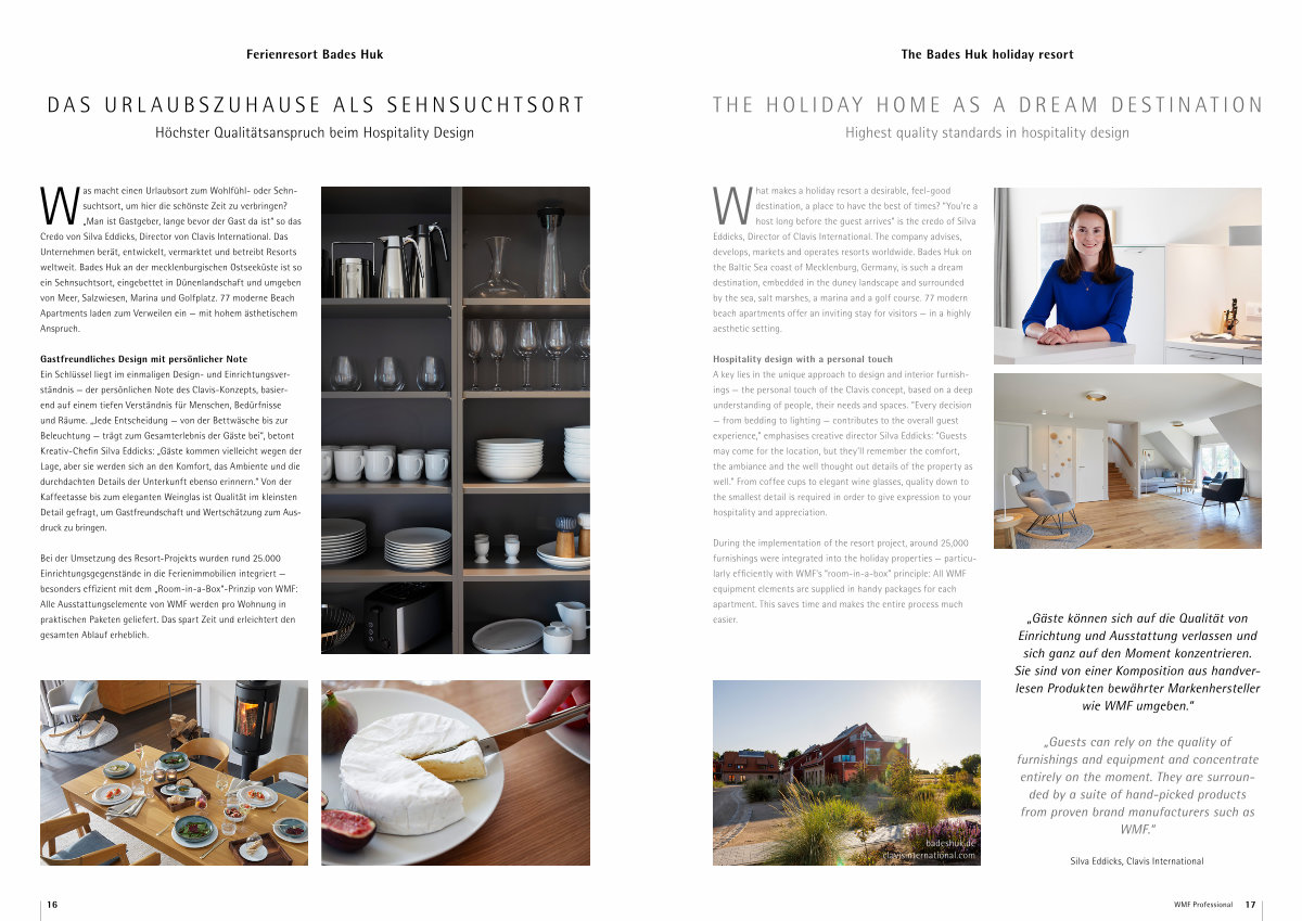 „ Gäste können sich auf die Qualität von Einrichtung und Ausstattung verlassen und sich ganz auf den Moment konzentrieren. Sie sind von einer Komposition aus handverlesen Produkten bewährter Markenhersteller wie WMF umgeben.“ badeshuk. de clavisinternational. com
