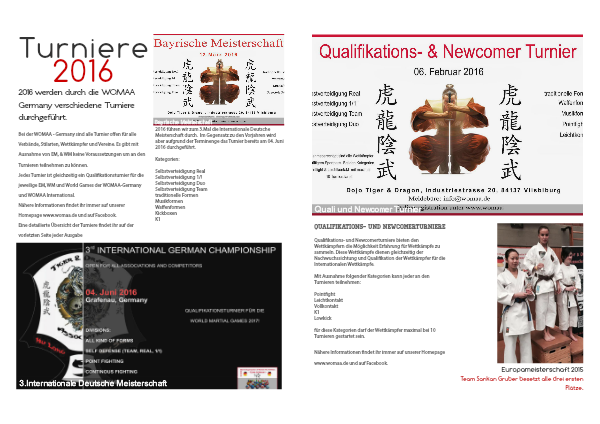 2016 werden durch die WOMAA Germany verschiedene Turniere durchgeführt.