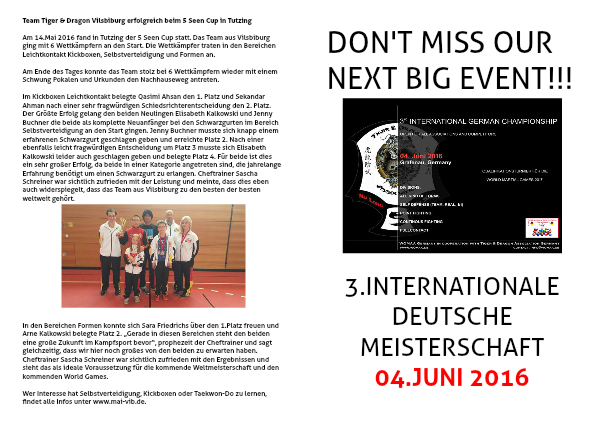 Am 14.Mai 2016 fand in Tutzing der 5 Seen Cup statt. Das Team aus Vilsbiburg ging mit 6 Wettkämpfern an den Start. Die Wettkämpfer traten in den Bereichen Leichtkontakt Kickboxen, Selbstverteidigung und Formen an.