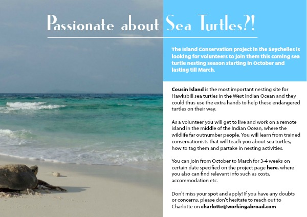 The Island Conservation project in the Seychelles is looking for volunteers to join them this coming sea turtle nesting season starting in October and lasting till March.