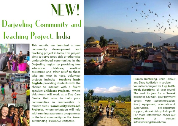 This month, we launched a new community development and teaching project in India. This project aims to serve poor, sick or otherwise underprivileged communities in the Darjeeling region by providing free education, childcare, medical assistance and other relief to those who are most in need. Volunteer projects include; teaching basic English, providing students with the chance to interact with a fluent speaker; Childcare Projects, where Volunteers will work at a Day Care Centre that aims to help poor communities in inaccessible or remote areas; Community Outreach Projects, where volunteers will help with running awareness programmes in the local community on the issues surrounding HIV/AIDS, Healthcare,