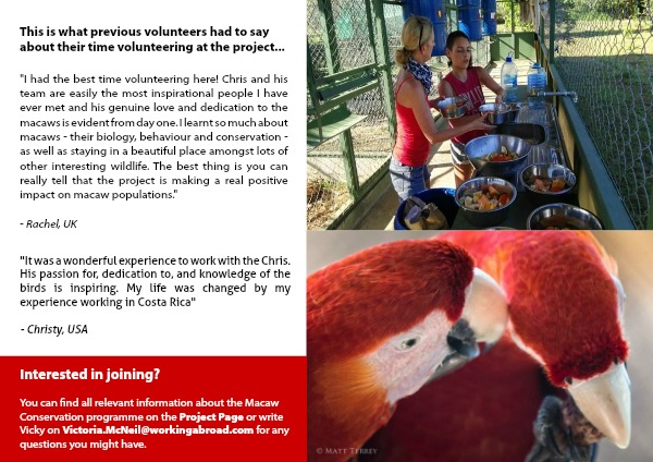 You can find all relevant information about the Macaw Conservation programme on the Project Page or write Vicky on Victoria.McNeil@workingabroad.com for any questions you might have.