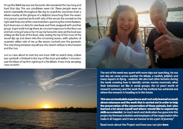 Just as I was about to start my one-hour shift on watch duty, a blow was spotted! I climbed to the top of the boat and within 5 minutes I saw the blow of my first sighting of a Fin Whale. It was truly amazing. I was ecstatic!