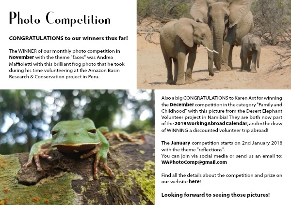 The WINNER of our monthly photo competition in November with the theme "faces" was Andrea Maffioletti with this brilliant frog photo that he took during his time volunteering at the Amazon Basin Research & Conservation project in Peru.