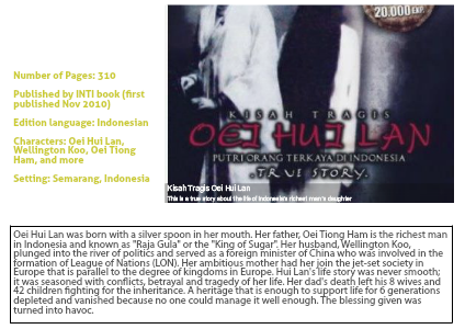 Oei Hui Lan was born with a silver spoon in her mouth. Her father, Oei Tiong Ham is the richest man in Indonesia and known as "Raja Gula" or the "King of Sugar". Her husband, Wellington Koo, plunged into the river of politics and served as a foreign minister of China who was involved in the formation of League of Nations (LON). Her ambitious mother had her join the jet-set society in Europe that is parallel to the degree of kingdoms in Europe. Hui Lan's life story was never smooth; it was seasoned with conflicts, betrayal and tragedy of her life. Her dad's death left his 8 wives and 42 children fighting for the inheritance. A heritage that is enough to support life for 6 generations depleted and vanished because no one could manage it well enough. The blessing given was turned into havoc.