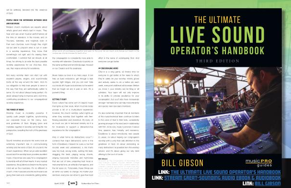 GETTING IT RIGHT Every culture has some sort of organic music that lights up their souls . Most churches today provide a bit of a multicultural experience ; however , the church worship culture lights up when they worship God together with freeflowing adoration and reverence . It ’ s every bit as much our job in technical ministry as it is for musicians to support a distraction-free experience for the congregation .
