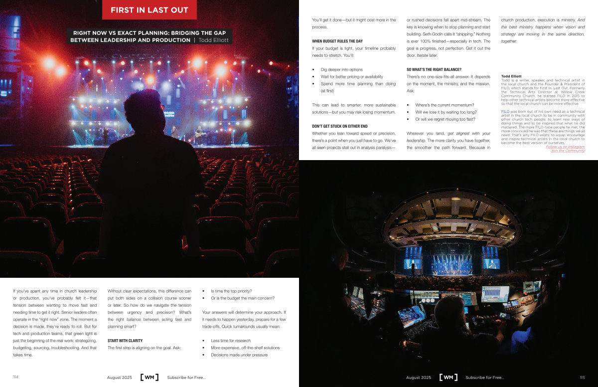 If you’ ve spent any time in church leadership or production, you’ ve probably felt it— that tension between wanting to move fast and needing time to get it right. Senior leaders often operate in the“ right now” zone. The moment a decision is made, they’ re ready to roll. But for tech and production teams, that green light is just the beginning of the real work: strategizing, budgeting, sourcing, troubleshooting. And that takes time.