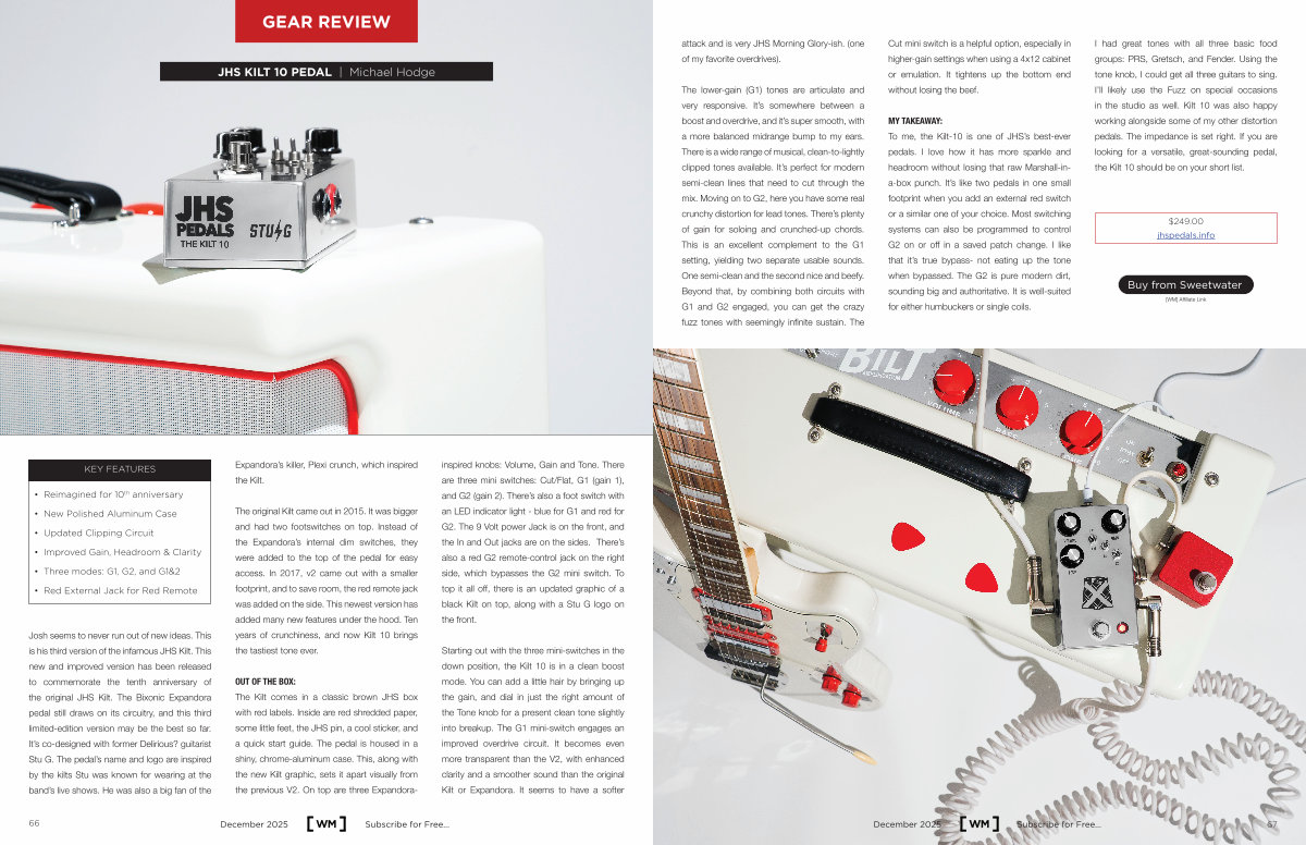 Josh seems to never run out of new ideas. This is his third version of the infamous JHS Kilt. This new and improved version has been released to commemorate the tenth anniversary of the original JHS Kilt. The Bixonic Expandora pedal still draws on its circuitry, and this third limited-edition version may be the best so far. It’ s co-designed with former Delirious? guitarist Stu G. The pedal’ s name and logo are inspired by the kilts Stu was known for wearing at the band’ s live shows. He was also a big fan of the