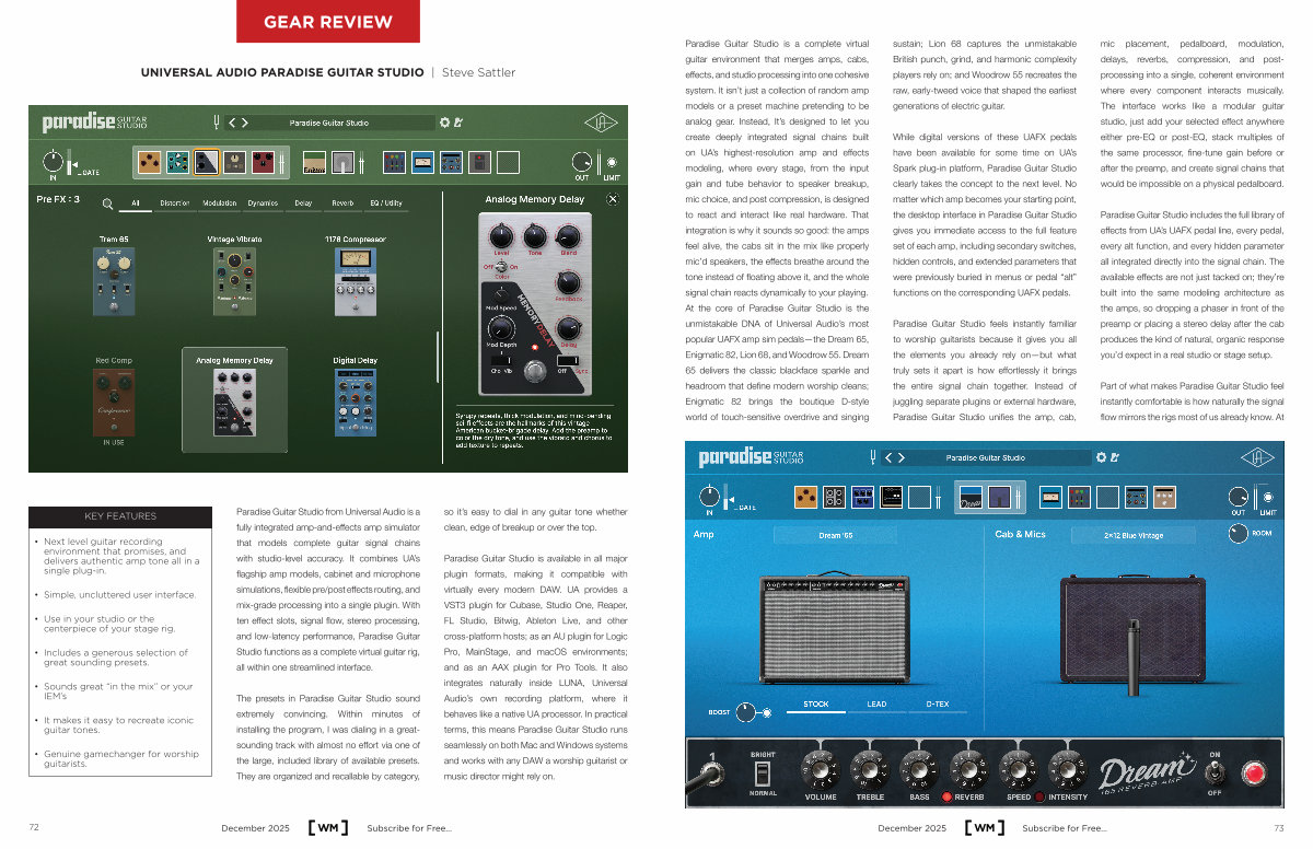 Paradise Guitar Studio is a complete virtual guitar environment that merges amps, cabs, effects, and studio processing into one cohesive system. It isn’ t just a collection of random amp models or a preset machine pretending to be analog gear. Instead, It’ s designed to let you create deeply integrated signal chains built on UA’ s highest-resolution amp and effects modeling, where every stage, from the input gain and tube behavior to speaker breakup, mic choice, and post compression, is designed to react and interact like real hardware. That integration is why it sounds so good: the amps feel alive, the cabs sit in the mix like properly mic’ d speakers, the effects breathe around the tone instead of floating above it, and the whole signal chain reacts dynamically to your playing. At the core of Paradise Guitar Studio is the unmistakable DNA of Universal Audio’ s most popular UAFX amp sim pedals— the Dream 65, Enigmatic 82, Lion 68, and Woodrow 55. Dream 65 delivers the classic blackface sparkle and headroom that define modern worship cleans; Enigmatic 82 brings the boutique D-style world of touch-sensitive overdrive and singing