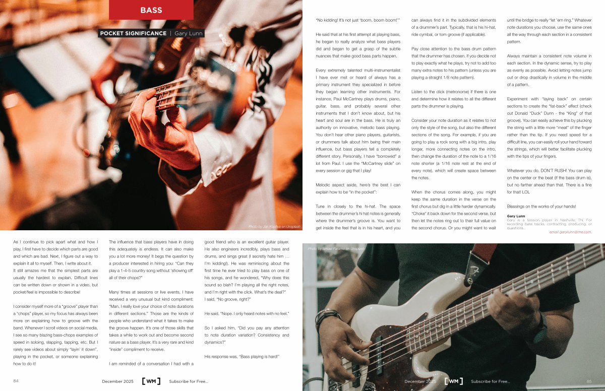 Every extremely talented multi-instrumentalist I have ever met or heard of always has a primary instrument they specialized in before they began learning other instruments. For instance, Paul McCartney plays drums, piano, guitar, bass, and probably several other instruments that I don’ t know about, but his heart and soul are in the bass. He is truly an authority on innovative, melodic bass playing. You don’ t hear other piano players, guitarists, or drummers talk about him being their main influence, but bass players tell a completely different story. Personally, I have“ borrowed” a lot from Paul. I use the“ McCartney slide” on every session or gig that I play!