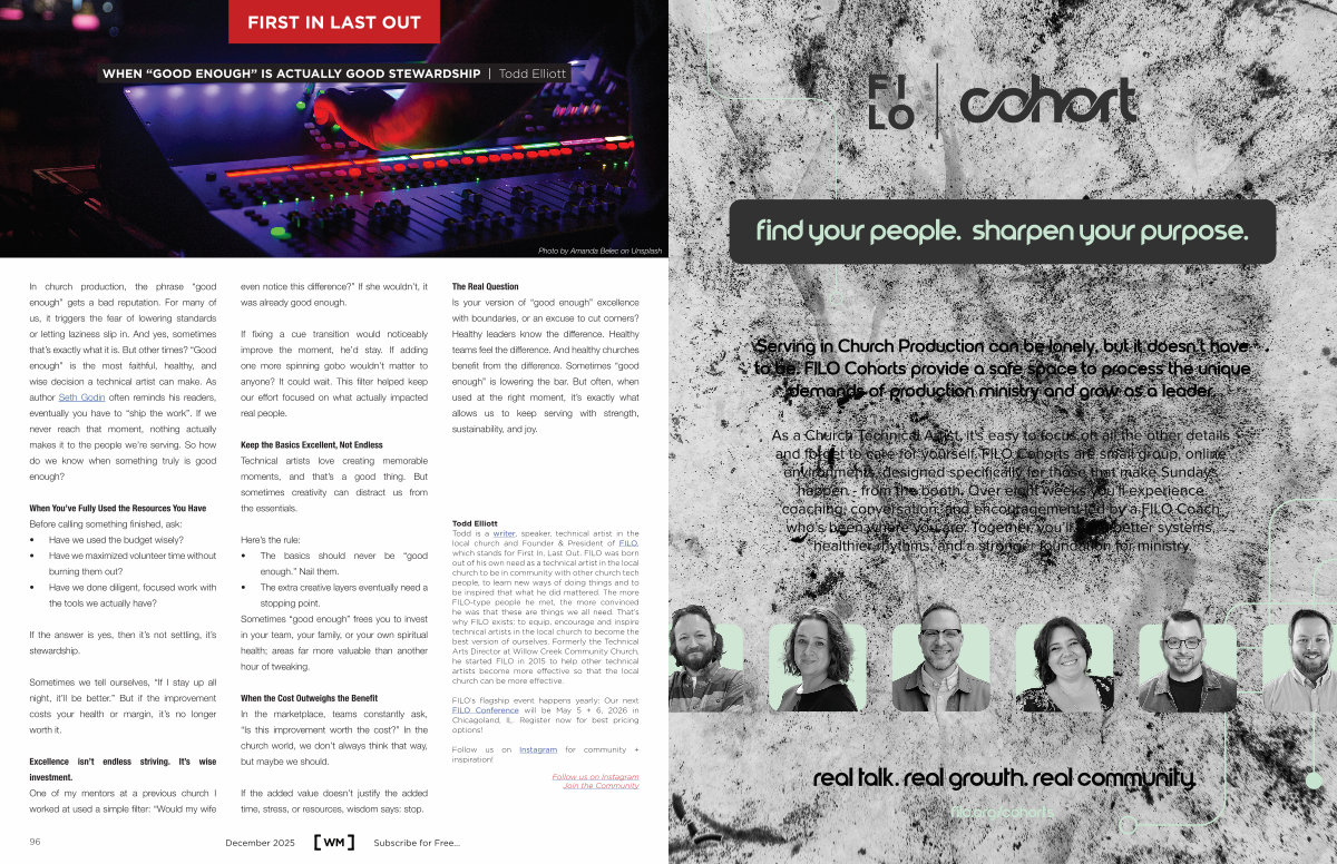 In church production, the phrase“ good enough” gets a bad reputation. For many of us, it triggers the fear of lowering standards or letting laziness slip in. And yes, sometimes that’ s exactly what it is. But other times?“ Good enough” is the most faithful, healthy, and wise decision a technical artist can make. As author Seth Godin often reminds his readers, eventually you have to“ ship the work”. If we never reach that moment, nothing actually makes it to the people we’ re serving. So how do we know when something truly is good enough?