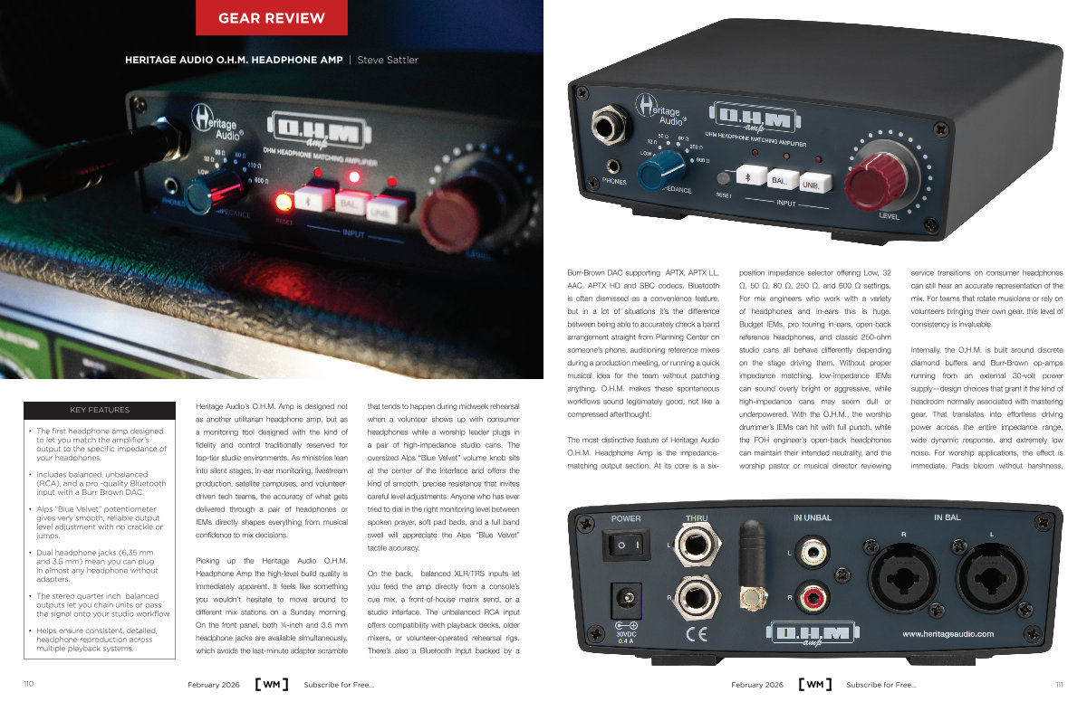 Heritage Audio’ s O. H. M. Amp is designed not as another utilitarian headphone amp, but as a monitoring tool designed with the kind of fidelity and control traditionally reserved for top-tier studio environments. As ministries lean into silent stages, in-ear monitoring, livestream production, satellite campuses, and volunteerdriven tech teams, the accuracy of what gets delivered through a pair of headphones or IEMs directly shapes everything from musical confidence to mix decisions.
