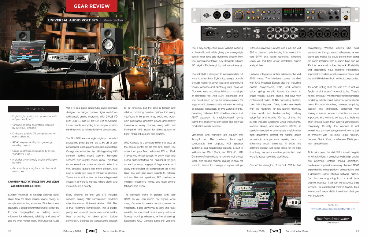 At its price point, the Volt 876 is a solid bargain for what it offers. It combines eight high-quality mic preamps, vintage analog coloration, hardware compression on every channel, ADAT expandability, cross-platform compatibility, and a genuinely useful, intuitive software bundle. For churches upgrading from a small twochannel interface, it will feel like a serious step forward. For established worship teams, it’ s a future-proof, expandable investment that you won’ t outgrow.