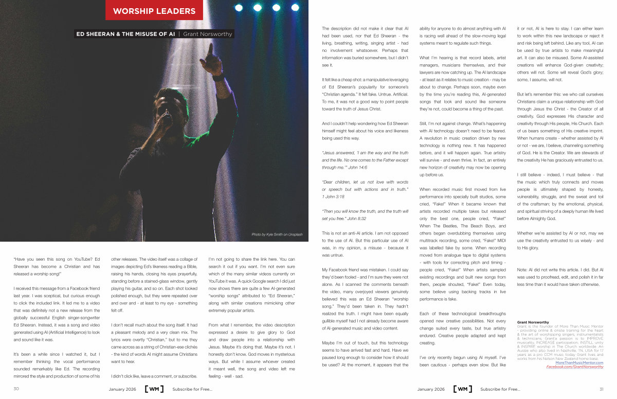 My Facebook friend was mistaken. I could say they’ d been fooled- and I’ m sure they were not alone. As I scanned the comments beneath the video, many overjoyed viewers genuinely believed this was an Ed Sheeran“ worship song.” They’ d been taken in. They hadn’ t realized the truth. I might have been equally gullible myself had I not already become aware of AI‐generated music and video content.