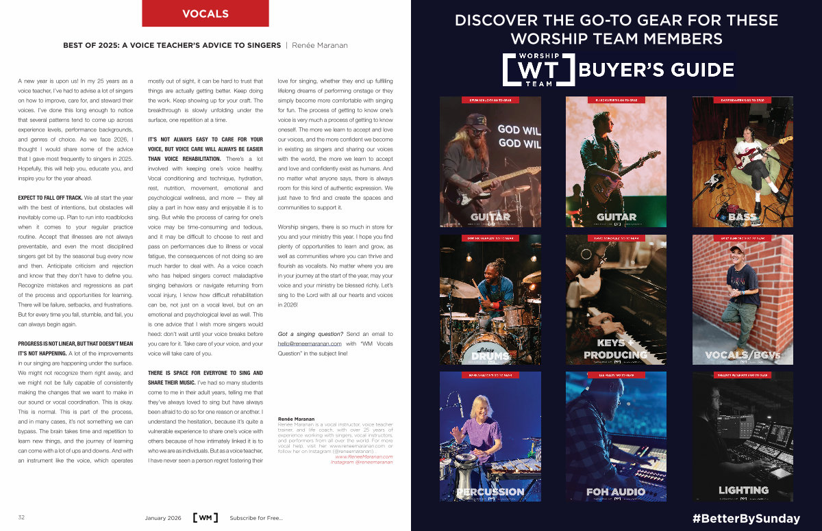 Worship singers, there is so much in store for you and your ministry this year. I hope you find plenty of opportunities to learn and grow, as well as communities where you can thrive and flourish as vocalists. No matter where you are in your journey at the start of the year, may your voice and your ministry be blessed richly. Let’ s sing to the Lord with all our hearts and voices in 2026!