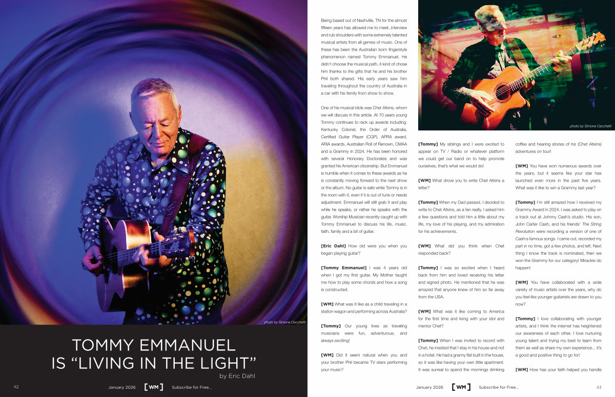 One of his musical idols was Chet Atkins, whom we will discuss in this article. At 70 years young Tommy continues to rack up awards including: Kentucky Colonel, the Order of Australia, Certified Guitar Player( CGP), APRA award, ARIA awards, Australian Roll of Renown, CMAA and a Grammy in 2024. He has been honored with several Honorary Doctorates and was granted his American citizenship. But Emmanuel is humble when it comes to these awards as he is constantly moving forward to the next show or the album. No guitar is safe while Tommy is in the room with it, even if it is out of tune or needs adjustment. Emmanuel will still grab it and play while he speaks, or rather he speaks with the guitar. Worship Musician recently caught up with Tommy Emmanuel to discuss his life, music, faith, family and a bit of guitar.