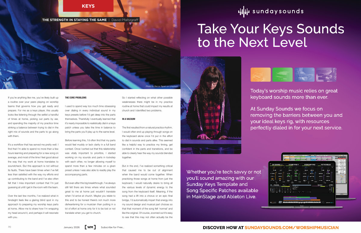 If you’ re anything like me, you’ ve likely built up a routine over your years playing on worship teams that governs how you get ready and prepare. For me as a keys player, this usually looks like listening through the setlist a handful of times at home, picking out parts by ear, and spending the majority of my practice time striking a balance between trying to dial in the right mix of sounds and the parts to go along with them.