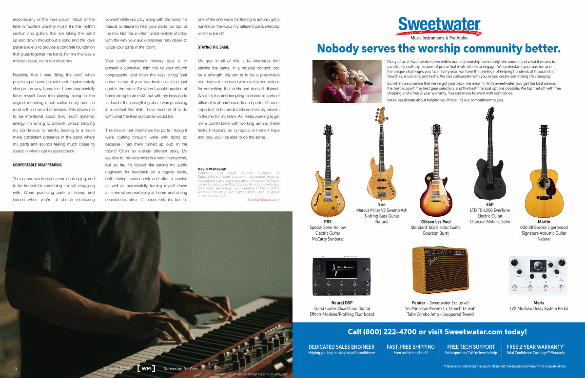 David Pfaltzgraff Founder and Lead Sound Designer at SundaySounds. com, a site that resources worship keys players and guitarists around the world. David currently resides in Des Moines, IA with his wife and two boys. He enjoys volunteering in his church’ s worship ministry, old synthesizers, and a good super-hero movie.