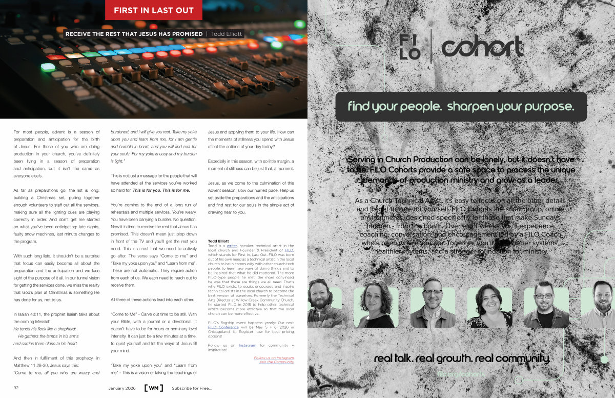 Todd Elliott Todd is a writer, speaker, technical artist in the local church and Founder & President of FILO, which stands for First In, Last Out. FILO was born out of his own need as a technical artist in the local church to be in community with other church tech people, to learn new ways of doing things and to be inspired that what he did mattered. The more FILO-type people he met, the more convinced he was that these are things we all need. That’ s why FILO exists: to equip, encourage and inspire technical artists in the local church to become the best version of ourselves. Formerly the Technical Arts Director at Willow Creek Community Church, he started FILO in 2015 to help other technical artists become more effective so that the local church can be more effective.