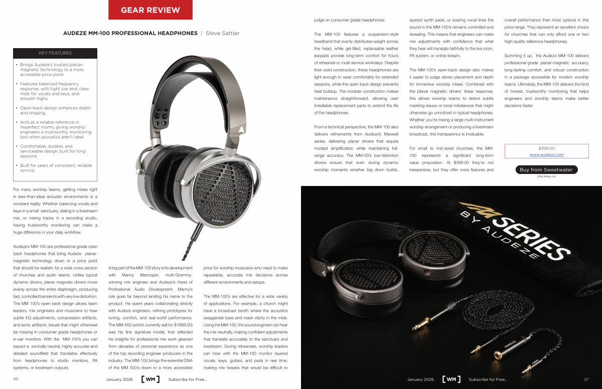 Summing it up, the Audeze MM-100 delivers professional-grade planar-magnetic accuracy, long-lasting comfort, and robust construction in a package accessible for modern worship teams. Ultimately, the MM-100 delivers the kind of honest, trustworthy monitoring that helps engineers and worship teams make better decisions faster.