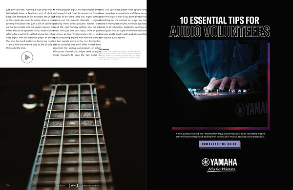 As many popular digital mixing consoles offer a high enough track count to pepper in a ‘ bonus ’ DI track or an extra ‘ amp out ’ signal without maxing out the mixable channels , I suggest grabbing them when possible . Rather than spend the next Sunday getting into the EQ weeds with just one bass input , think of your bass tone as two complementary bits — and have fun playing around with how the blend of the two signals works in the mix . Remember that on consoles that don ’ t offer in-desk time alignment for adding compression or other effects per channel , you might need to adjust things manually to keep the two tracks in sync . Ask your bass player what options they have regarding amp outputs and throw up an extra mic to play with if you don ’ t already have something on the cabinet on stage . As I ’ ve noted in many past articles , no single approach works in all situations . Hopefully , splitting out bass signals into a couple of different dedicated channels yields good results and adds another tool to your audio toolkit !