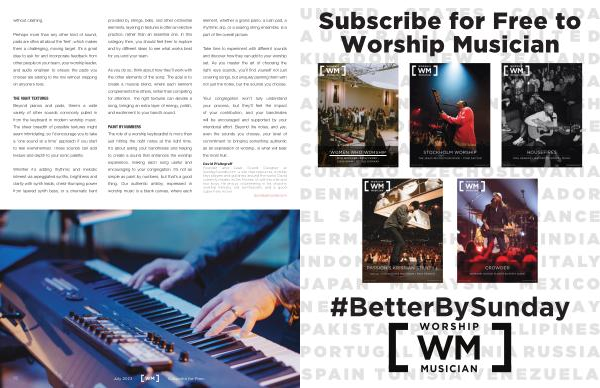 PAINT BY NUMBERS The role of a worship keyboardist is more than just hitting the right notes at the right time . It ’ s about aiding your bandmates and helping to create a sound that enhances the worship experience , making each song useful and encouraging to your congregation . It ’ s not as simple as paint by numbers , but that ’ s a good thing . Our authentic artistry , expressed in worship music is a blank canvas , where each element , whether a grand piano , a lush pad , a rhythmic arp , or a soaring string ensemble , is a part of the overall picture .