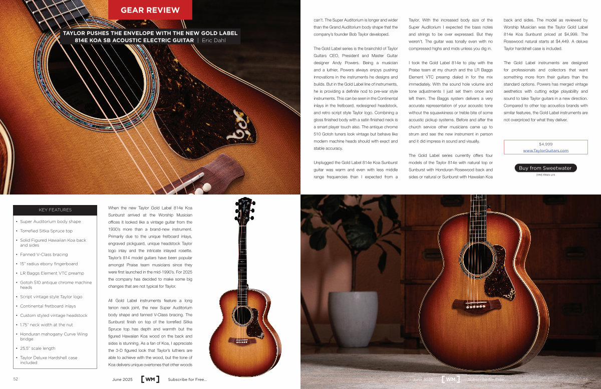 When the new Taylor Gold Label 814e Koa Sunburst arrived at the Worship Musician offices it looked like a vintage guitar from the 1930’ s more than a brand-new instrument. Primarily due to the unique fretboard inlays, engraved pickguard, unique headstock Taylor logo inlay and the intricate inlayed rosette. Taylor’ s 814 model guitars have been popular amongst Praise team musicians since they were first launched in the mid-1990’ s. For 2025 the company has decided to make some big changes that are not typical for Taylor.