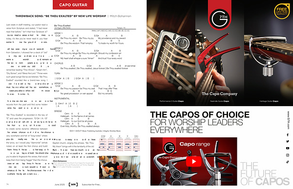 “ Be Thou Exalted” is recorded in the key of“ E” and uses the progression,“ E / G # / A / B“ over and over, which is perfectly simple with the Short-Cut Capo. For this song, it’ s good to create some dynamic difference between the verses, chorus, and bridge. The chorus is very worshipful and full of“ long-notes” where you don’ t really want the guitar to overtake the lyrics, so I would play“ diamonds”( whole notes) on at least the first chorus and build them through the song. Another way to think of it is to just play and hold the chord changes. If you’ re able to fingerpick the verses, that would keep them from being“ bigger” than the chorus. However, as I play through the song, a gentle, time-keeping strum would still work on the verses and then let the chorus soar. The bridge is where the dynamic ramps up.
