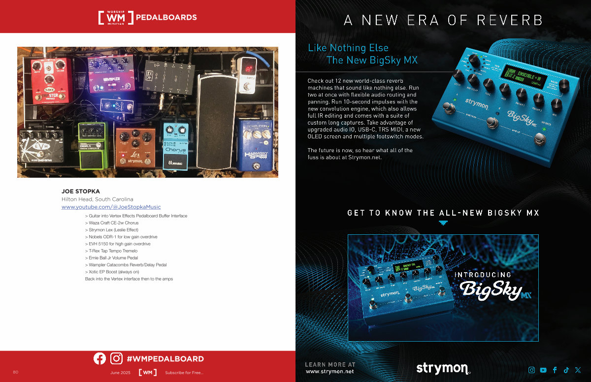 > Guitar into Vertex Effects Pedalboard Buffer Interface > Waza Craft CE-2w Chorus > Strymon Lex( Leslie Effect) > Nobels ODR-1 for low gain overdrive > EVH 5150 for high gain overdrive > T-Rex Tap Tempo Tremelo > Ernie Ball Jr Volume Pedal > Wampler Catacombs Reverb / Delay Pedal > Xotic EP Boost( always on) Back into the Vertex interface then to the amps