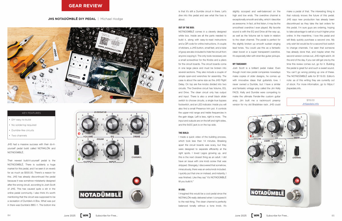 MY TAKEAWAY: Josh Scott is a brilliant pedal maker. Even though most new pedal companies nowadays make copies of older designs, he comes up with innovative ideas that guitarists love. I never owned a Dumble, but I have a similar and fantastic vintage amp called the Jim Kelly FACS. Kelly and Dumble were competing to make the ultimate Fender-like custom guitar amp. Jim built me a rackmount preamp version for my old Bradshaw rack. JHS could make a pedal of that. The interesting thing is that nobody knows the future of this pedal. JHS says new production has already been discontinued as they take the last orders for this pedal. I’ m sure guys are ordering, hoping to take advantage to sell at a much higher price online. In the meantime, I love this pedal and will likely quickly purchase a second one. My only wish list would be for a second foot switch to change channels. I’ ve seen that someone has already done that, and maybe when the second version comes out, JHS might add it. At the end of the day, if you can still get one by the time this review comes out, go for it. Building the pedal is great fun and such a sweet sound. You can’ t go wrong picking up one of these. The NOTADÜMBLË sells for $ 119.00. Editor’ s note: as of this writing they are currently out of stock. For more information, go to https:// jhspedals. info.