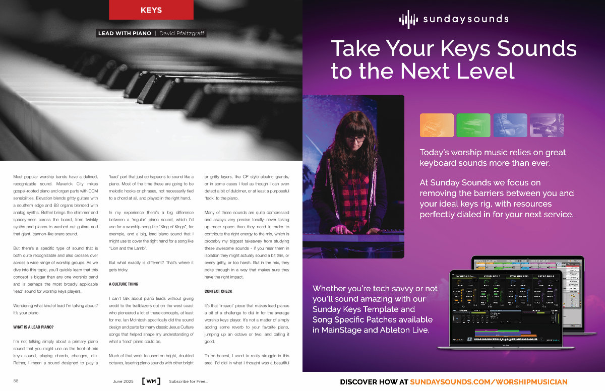 But there’ s a specific type of sound that is both quite recognizable and also crosses over across a wide range of worship groups. As we dive into this topic, you’ ll quickly learn that this concept is bigger than any one worship band and is perhaps the most broadly applicable‘ lead’ sound for worship keys players.