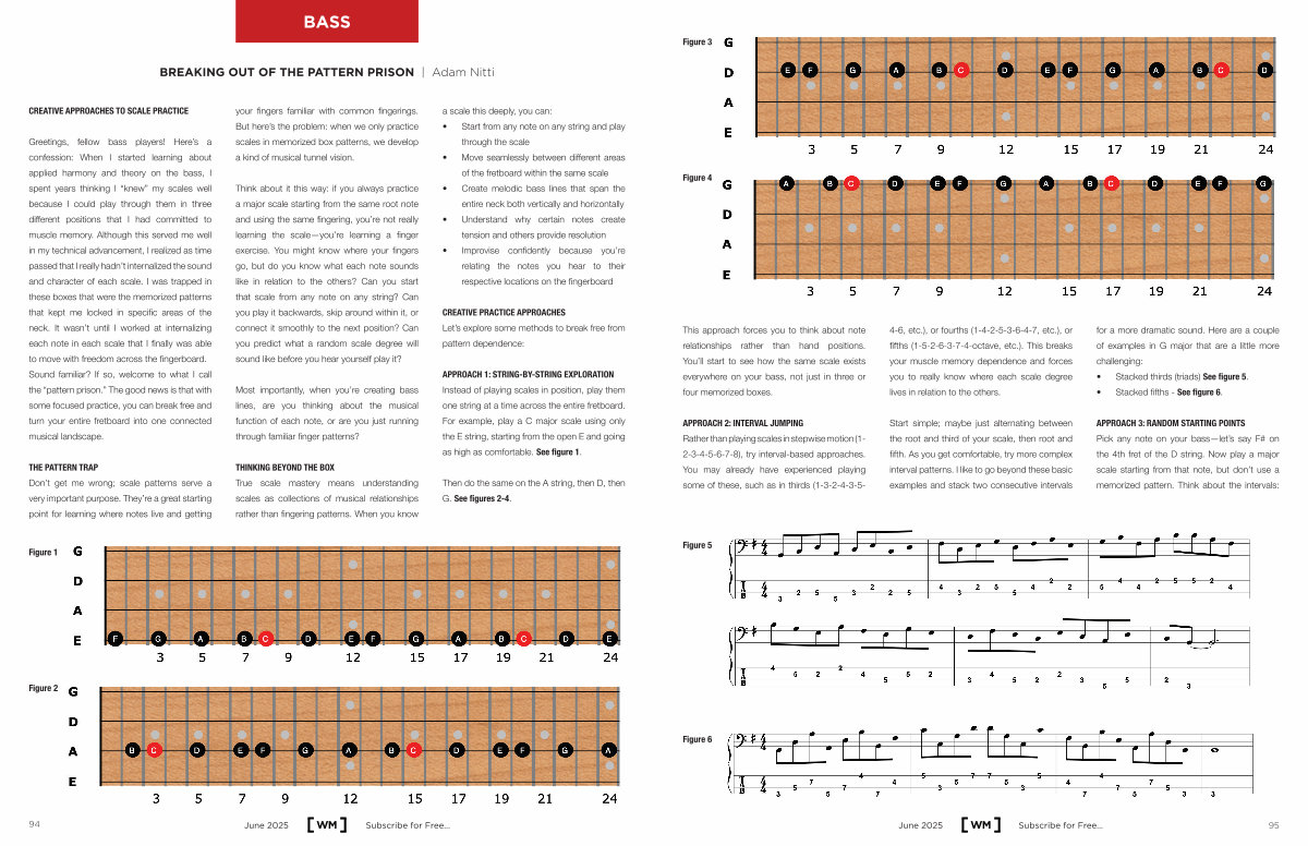 This approach forces you to think about note relationships rather than hand positions. You’ ll start to see how the same scale exists everywhere on your bass, not just in three or four memorized boxes.