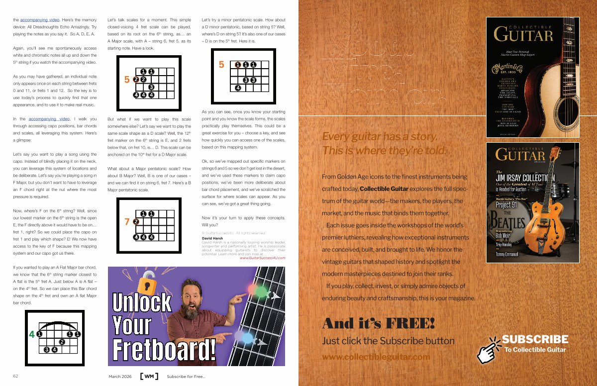 In the accompanying video, I walk you through accessing capo positions, bar chords and scales, all leveraging this system. Here’ s a glimpse: