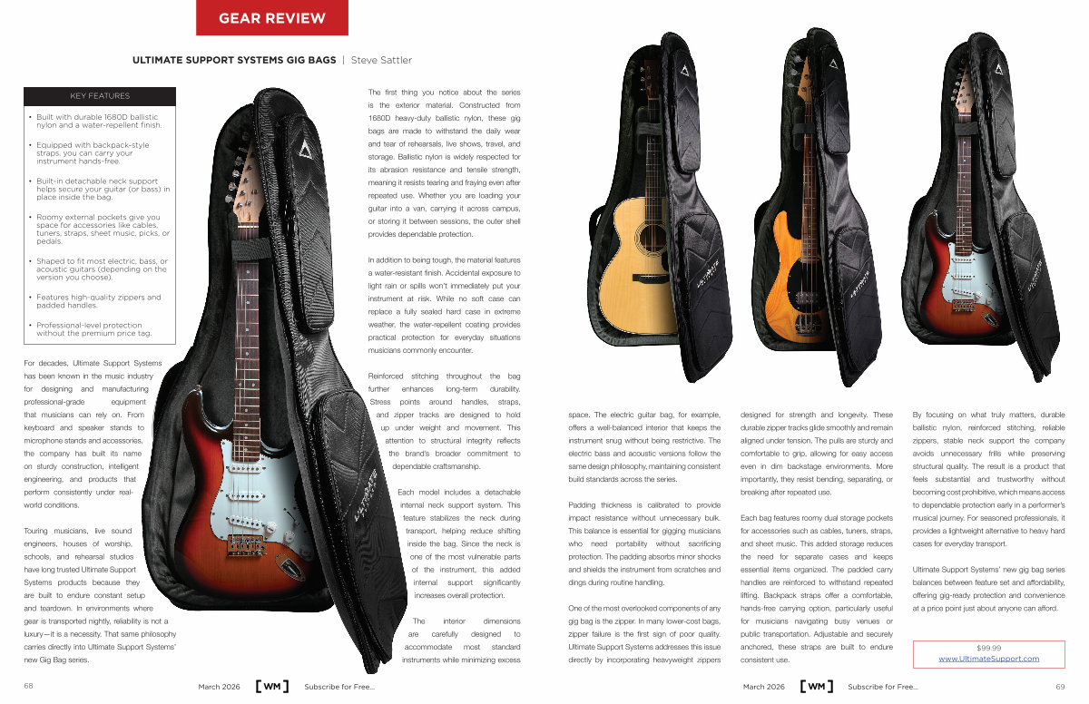 Touring musicians, live sound engineers, houses of worship, schools, and rehearsal studios have long trusted Ultimate Support Systems products because they are built to endure constant setup and teardown. In environments where gear is transported nightly, reliability is not a luxury— it is a necessity. That same philosophy carries directly into Ultimate Support Systems’ new Gig Bag series.