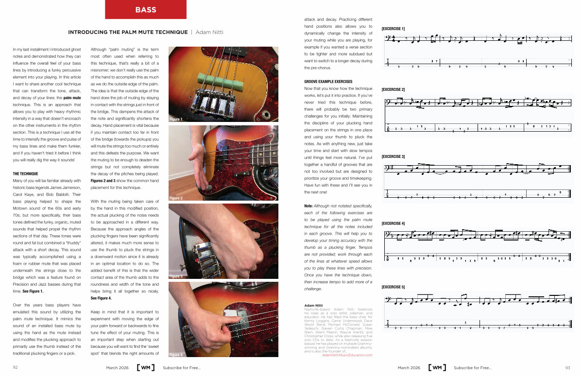 In my last installment I introduced ghost notes and demonstrated how they can influence the overall feel of your bass lines by introducing a funky percussive element into your playing. In this article I want to share another cool technique that can transform the tone, attack, and decay of your lines: the palm mute technique. This is an approach that allows you to play with heavy rhythmic intensity in a way that doesn’ t encroach on the other instruments in the rhythm section. This is a technique I use all the time to intensify the groove and pulse of my bass lines and make them funkier, and if you haven’ t tried it before I think you will really dig the way it sounds!