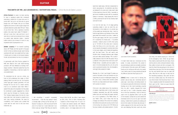 [ Chris Rocha ] For years I ’ ve been wanting to have a signature pedal that enveloped everything I wanted for my lead tone and I ’ m proud that I set out to do that with my good friends from JET Pedals . We put our heads together and came out with a super unique and powerful distortion pedal called “ Mr Jax ”. Many of you know that I did a signature overdrive pedal a few years back called “ El Valiente ”. I still use it every time I play and love it , but it was time to invest some serious time to create my perfect lead distortion pedal . I wanted Eddie Lozano to do a review on it and I ’ m very impressed with his perspective on it .