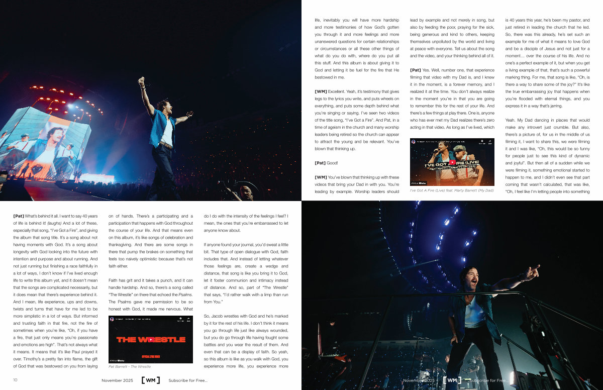 [ WM ] Excellent. Yeah, it’ s testimony that gives legs to the lyrics you write, and puts wheels on everything, and puts some depth behind what you’ re singing or saying. I’ ve seen two videos of the title song,“ I’ ve Got a Fire”. And Pat, in a time of ageism in the church and many worship leaders being retired so the church can appear to attract the young and be relevant. You’ ve blown that thinking up.