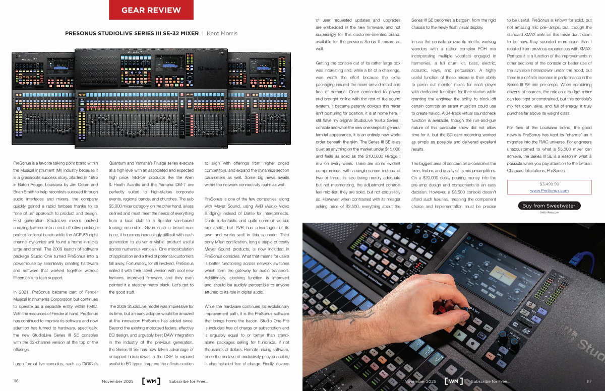 In 2021, PreSonus became part of Fender Musical Instruments Corporation but continues to operate as a separate entity within FMIC. With the resources of Fender at hand, PreSonus has continued to improve its software and now attention has turned to hardware, specifically, the new StudioLive Series III SE consoles with the 32-channel version at the top of the offerings.
