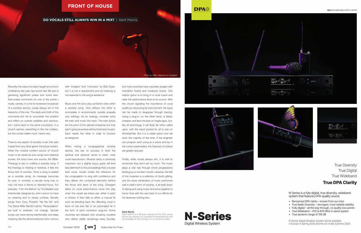 Recently, the video of a class I taught at a church conference last year has found new life and is garnering significant praise and some lessthan-praise comments for one of the points I made, namely: in a mix for livestream broadcast of a worship service, vocals always win in the hierarchy of the mix. The back-and-forth of the comments led me to reconsider the position and reflect on outside variables and opinions, but I came back to the same conclusion. In a church service, everything in the mix matters, but the vocals matter more. Here’ s why.