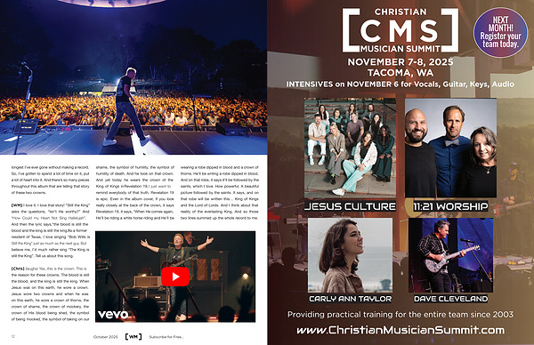 [ WM ] I love it. I love that story!“ Still the King” asks the questions,“ Isn’ t He worthy?” And“ How Could my Heart Not Sing Hallelujah”. And then the lyric says,“ the blood is still the blood and the king is still the king.” As a former resident of Texas, I love singing“ Bob Wills is Still the King” just as much as the next guy. But believe me, I’ d much rather sing“ The King is still the King”. Tell us about this song. shame, the symbol of humility, the symbol of humility of death. And he took on that crown. And yet today he wears the crown of the King of Kings in Revelation 19, I just want to remind everybody of that truth. Revelation 19 is epic. Even in the album cover, if you look really closely at the back of the crown, it says Revelation 19, it says,“ When He comes again, He’ ll be riding a white horse riding and He’ ll be wearing a robe dipped in blood and a crown of thorns. He’ ll be writing a robe dipped in blood. And on that robe, it says it’ ll be followed by the saints, which I love. How powerful. A beautiful picture followed by the saints. It says, and on that robe will be written this … King of Kings and the Lord of Lords. And I think about that reality of the everlasting King. And so those two lines summed up the whole record to me.